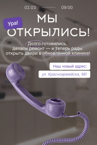 С нетерпением ждём вас по новому адресу и будем счастливы видеть вас в обновлённой клинике.